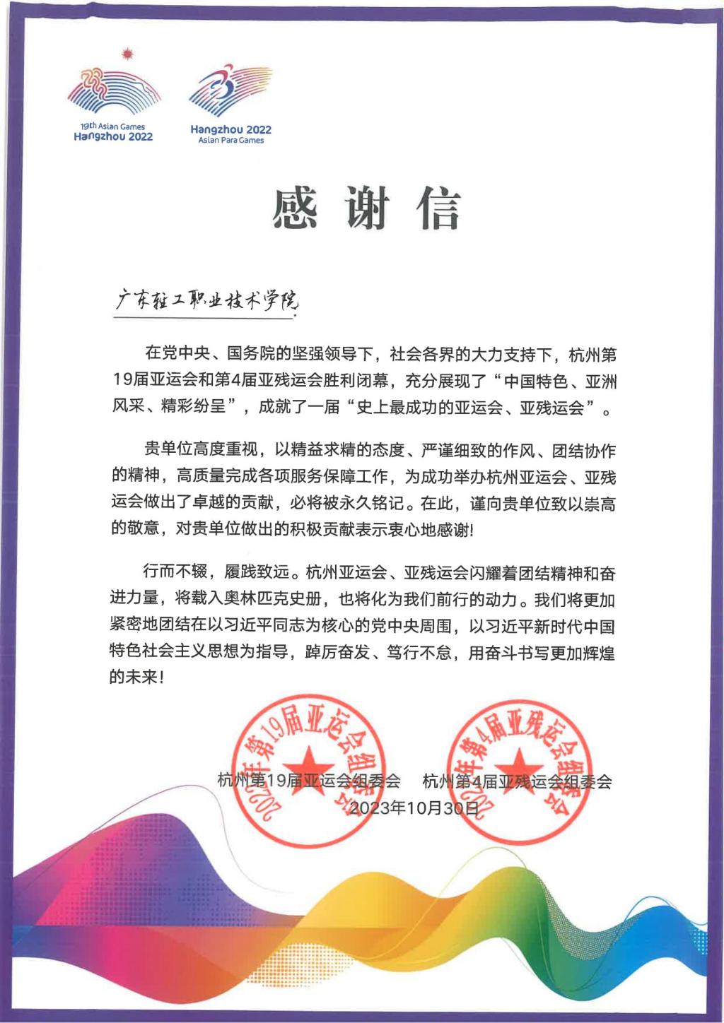 杭州亚运会组委会对我校协助工作表示感谢