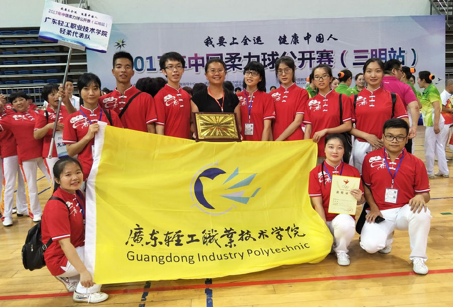 我校派出的“轻柔队”由陈健琛(造纸151)、乔喻(化妆品152)、李增煌(电商152)、马念(网店151)、招钰榕(化妆品151)、黄生华(生物151)、王晓菲(应用德语151)、吴美娣(化妆品162)、叶紫缘(生物161)、马志壕(数控161)共10名运动员组成,经过长期的刻苦训练,在比赛中表现突出,荣获集体规定套路第一名。