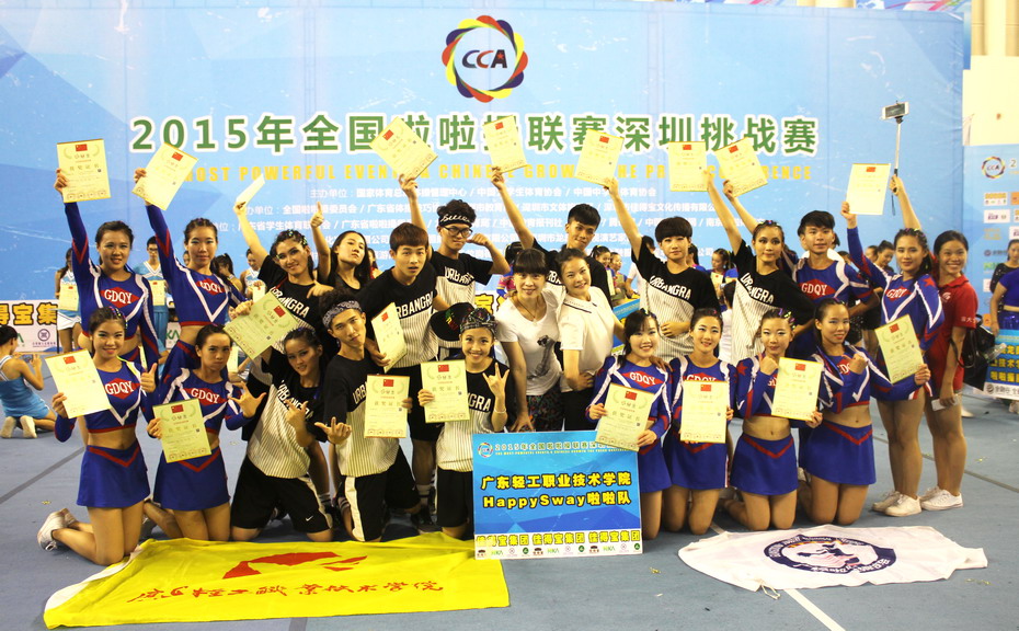 我校happy Sway啦啦操队出战2014-2015年全国啦啦操联赛城市挑战赛(深圳站),获得大学甲组集体花球自选动作第一名、大学甲组集体街舞自选动作第一名。该赛于5月28日至30日在深圳龙岗体育馆隆重举行,由国家体育总局体操运动管理中心、中国大学生体育协会、中国中学生体育协会主办,共有66所学校、1600多名运动员参加比赛。本次出赛队伍由学校副院长李丽、杜少辉主任担任领队,周新乐、陈绿波、陈俊老师负责训练和指导。(体育部)